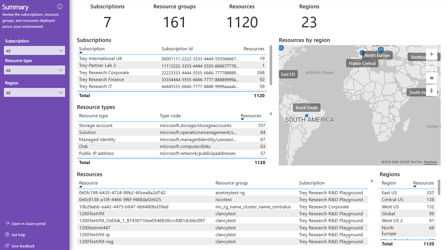 La página Resumen proporciona un resumen de las suscripciones, los tipos de recursos, los recursos y las regiones en todo el entorno.