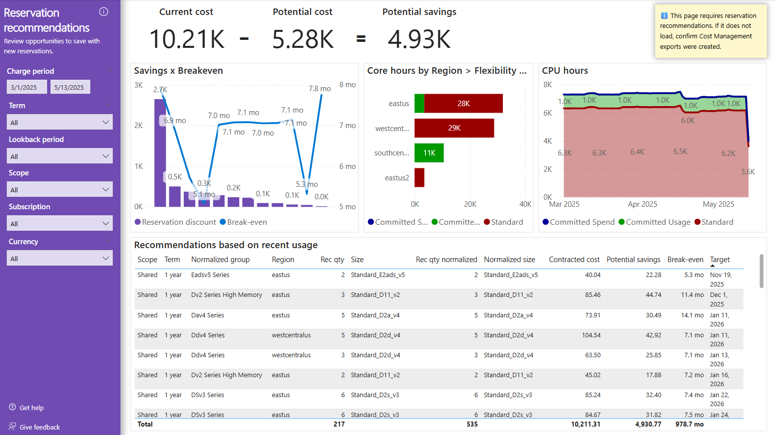 La página de recomendaciones de reserva utiliza las exportaciones de Cost Management directamente en el almacenamiento (a través del parámetro Export Storage URL) o como parte de los hubs de FinOps. Si no ve recomendaciones, confirme que ha configurado las exportaciones y los filtros de la parte superior de la página se alinean con las recomendaciones que exportó (por ejemplo, término, retrospectiva y ámbito).