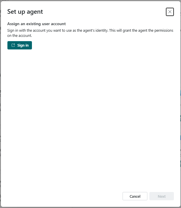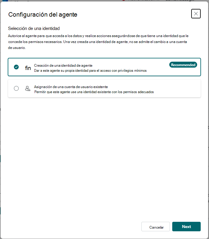 Se recomienda crear una identidad de agente. Para obtener más información, consulte ¿Qué son las identidades de agente?.