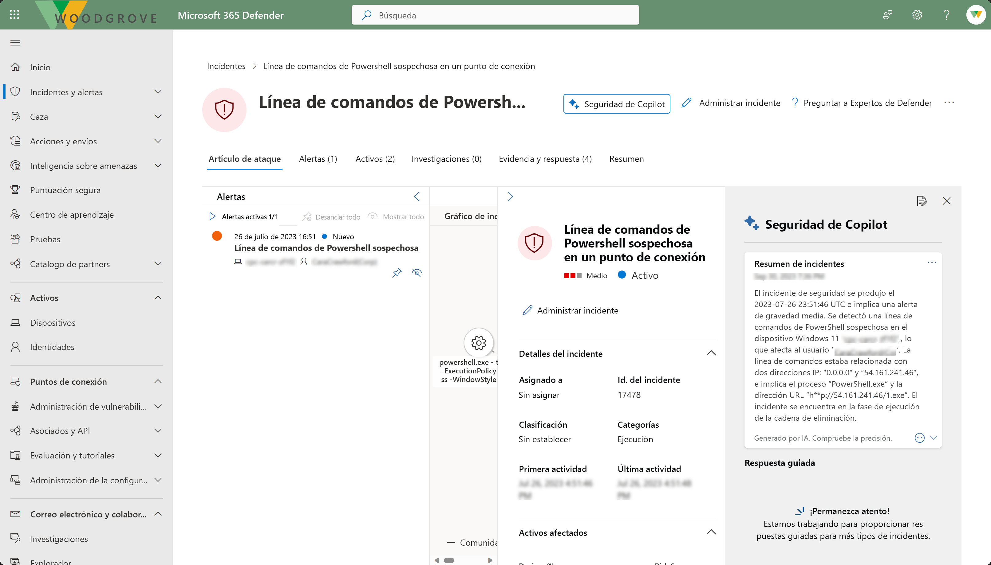 Use Security Copilot para proporcionar una evaluación del incidente con pruebas complementarias y un conjunto de recomendaciones.