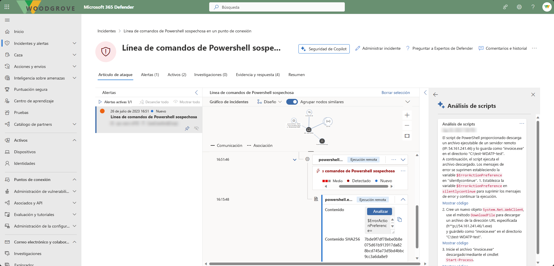 En este ejemplo, Security Copilot se usa para realizar una investigación completa de incidentes mediante la recopilación de información contextual de alertas, el análisis de un script sospechoso y la generación de una evaluación acompañada de un conjunto de pasos de corrección.