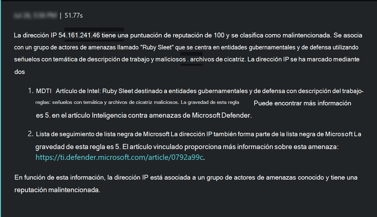 En este caso de uso, Security Copilot ayudó a realizar una investigación exhaustiva de un incidente. Con el lenguaje natural, los analistas pueden obtener una explicación de lo que está haciendo el script sospechoso y comprobar que los indicadores del script están asociados a actores de amenazas conocidos.