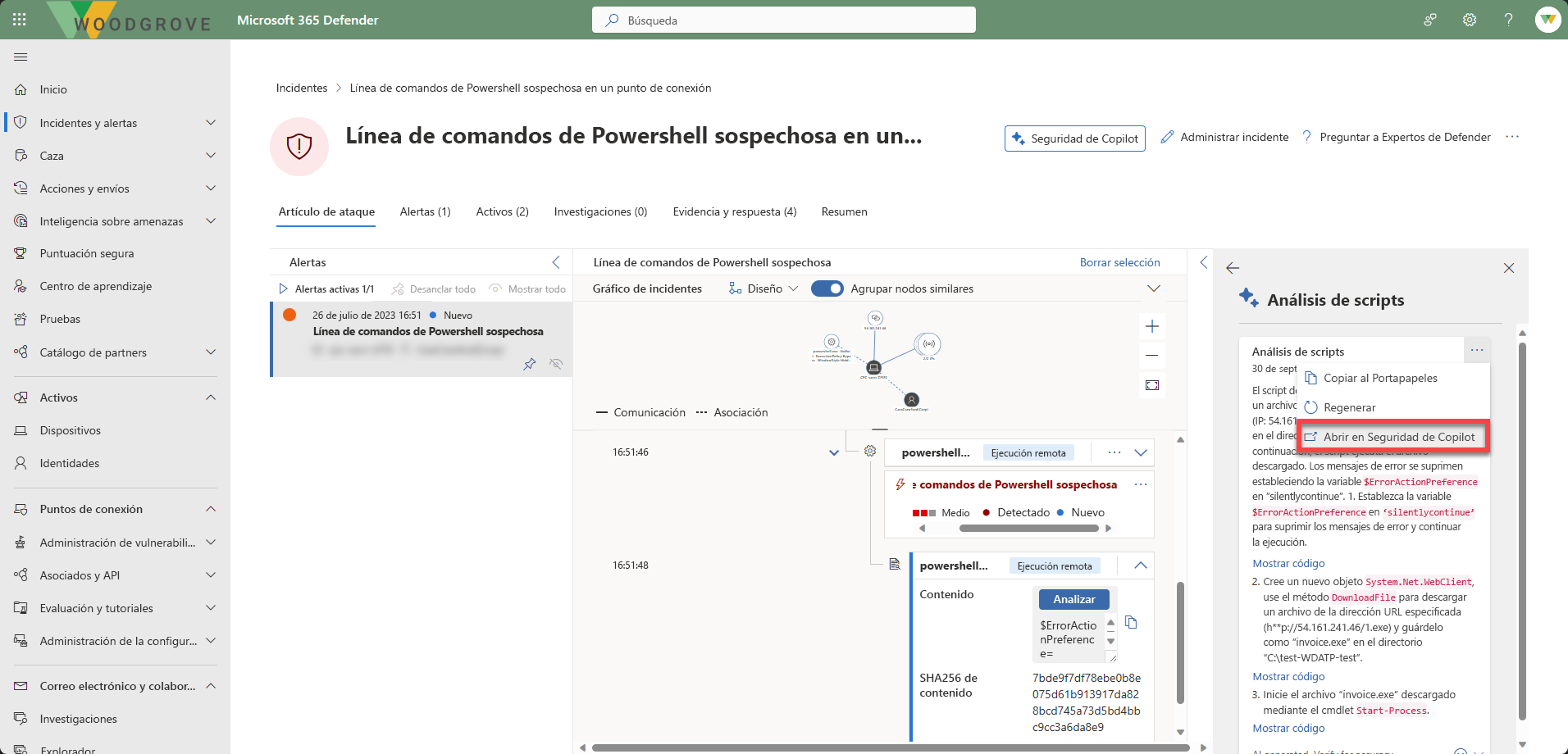 Para continuar con la investigación en la experiencia independiente de Security Copilot, seleccione Abrir en Security Copilot.