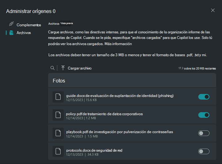 Puede cargar un archivo en Microsoft Security Copilot para permitir que Copilot haga referencia al contenido del archivo para obtener respuestas cuando solicite a Copilot y mencione los "archivos cargados".