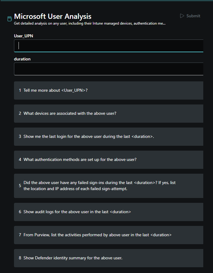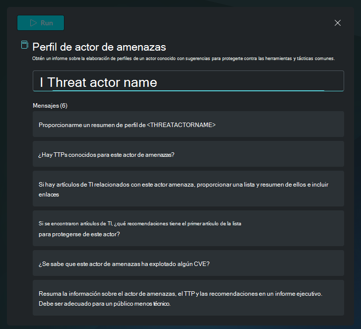 Security Copilot viene con promptbooks precompilados, una serie de mensajes que se han reunido para realizar tareas específicas relacionadas con la seguridad. Pueden funcionar de forma similar a los cuadernos de estrategias de seguridad(flujos de trabajo listos para usar que pueden servir como plantillas para automatizar pasos repetitivos), por ejemplo, en relación con la respuesta a incidentes o las investigaciones. Cada promptbook precompilado requiere una entrada específica (por ejemplo, un fragmento de código o un nombre de actor de amenaza).