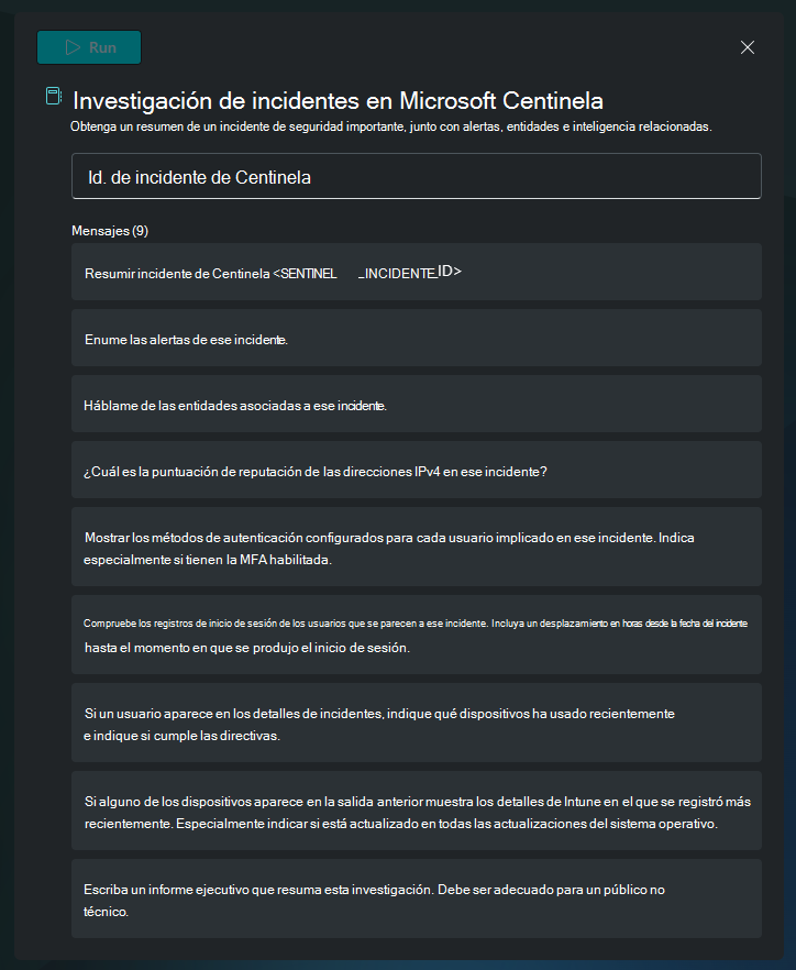 Para ejecutar el promptbook de investigación de incidentes de Microsoft Sentinel: