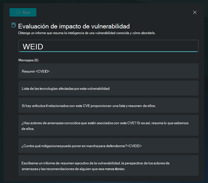 El promptbook de evaluación de impacto de vulnerabilidad acepta un número de CVE o un nombre de vulnerabilidad conocido para averiguar si la vulnerabilidad se ha divulgado o explotado públicamente y si la han usado los actores de amenazas en sus campañas. A continuación, puede proporcionar recomendaciones para abordar o mitigar la amenaza y resumir estos hallazgos en un resumen ejecutivo.