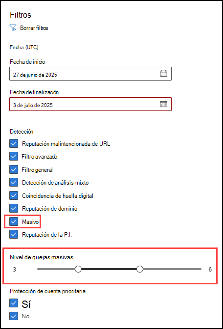 Filtrar. En el control flotante Filtros que se abre, seleccione solo el valor Detecciónmasivo en el control flotante Filtros que se abre. Use el control deslizante Nivel de queja masiva para aumentar o reducir el umbral de BCL.
