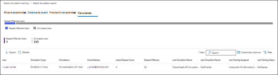 La tarjeta Reincidentes de las pestañas Información general e Informes muestra la información sobre los reincidentes. Un delincuente reincidente es un usuario que se vio comprometido por simulaciones consecutivas. El número predeterminado de simulaciones consecutivas es dos, pero puede cambiar el valor en la pestaña Configuración de Entrenamiento de simulación de ataque en https://security.microsoft.com/attacksimulator?viewid=setting. Para obtener más información, consulte Configuración del umbral de reincidente.