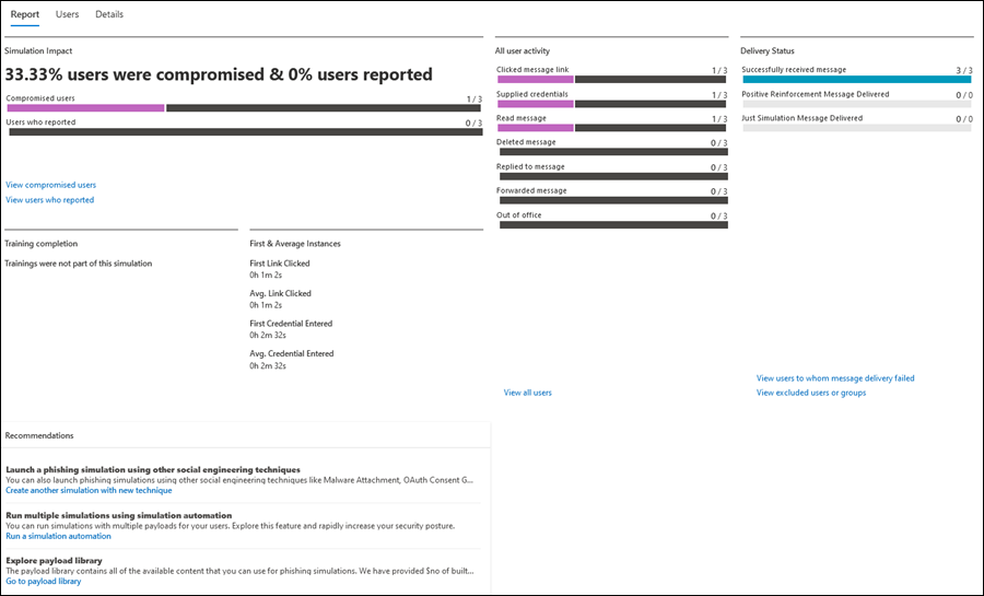 Al seleccionar Ver informe de finalización de entrenamiento , se le llevará a la pestaña Finalización del entrenamiento del informe Simulación de ataque.