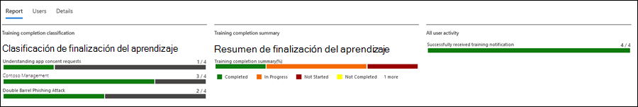 La tarjeta De finalización del entrenamiento de las pestañas Información general e Informes organiza los porcentajes de usuarios que recibieron entrenamientos en función de los resultados de las simulaciones en las categorías siguientes: