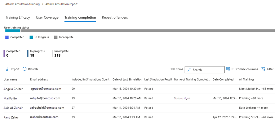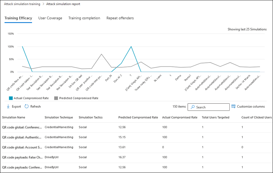 - Informes de simulaciones en curso y completadas y campañas de entrenamiento: para obtener más información, consulte Informe de simulación de ataques.