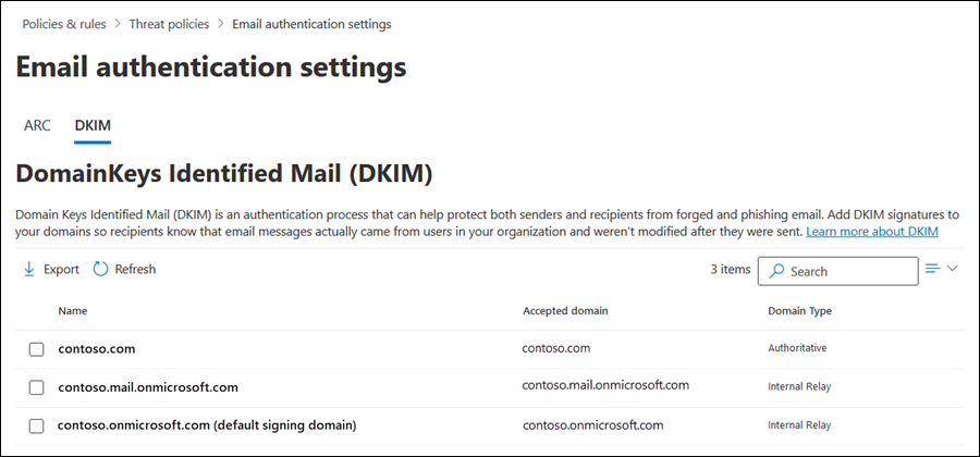 Si usa solo el dominio de dirección de enrutamiento de Email (MOERA) de Microsoft Online para el correo electrónico (por ejemplo, contoso.onmicrosoft.com): no es necesario hacer nada. Los mensajes salientes de los remitentes del dominio contoso.onmicrosoft.com se firman automáticamente mediante DKIM mediante el dominio contoso.onmicrosoft.com.