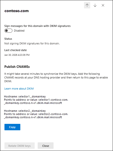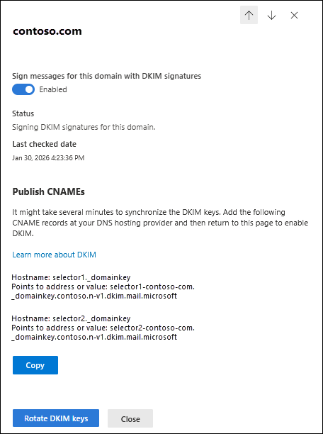 - Solo puede girar claves DKIM en dominios con los dos valores de propiedad siguientes en la pestaña DKIM de la página de configuración de autenticación de Email: