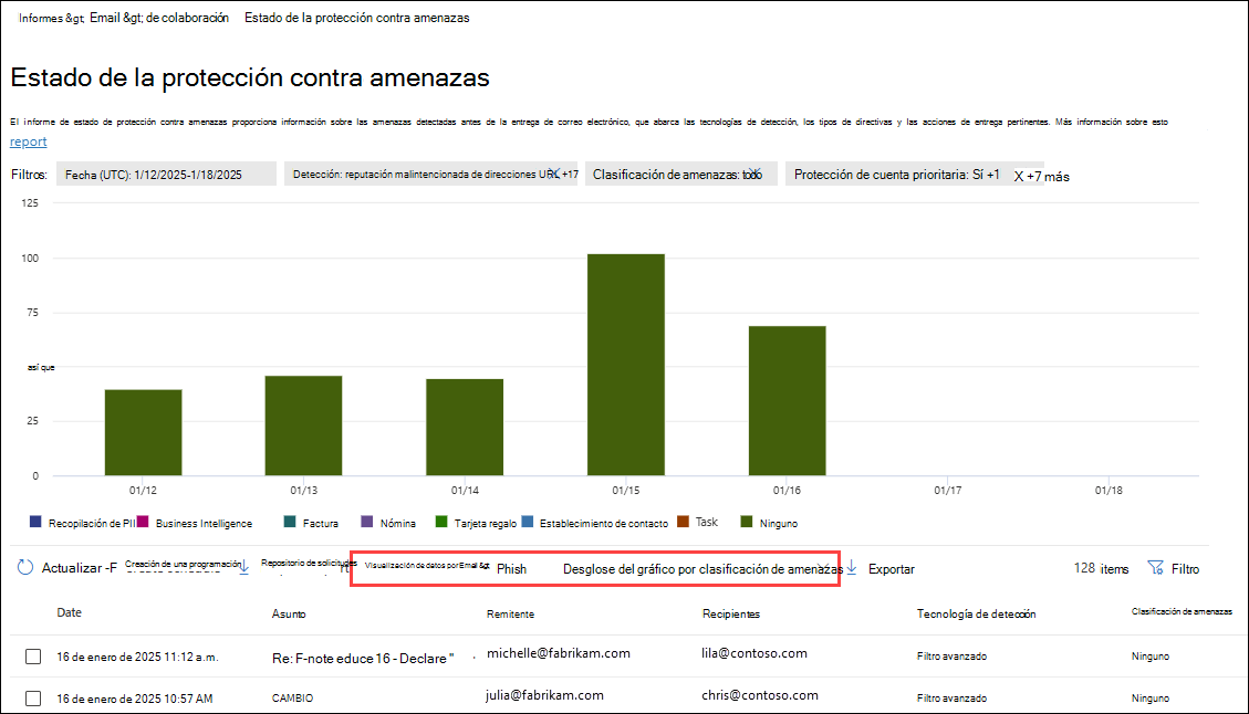 - Correo electrónico de phishing: esta selección le lleva a ver los datos Email > análisis de phish y gráficos por tecnología de detección en el informe de estado de protección contra amenazas.