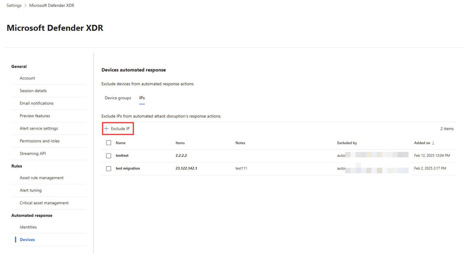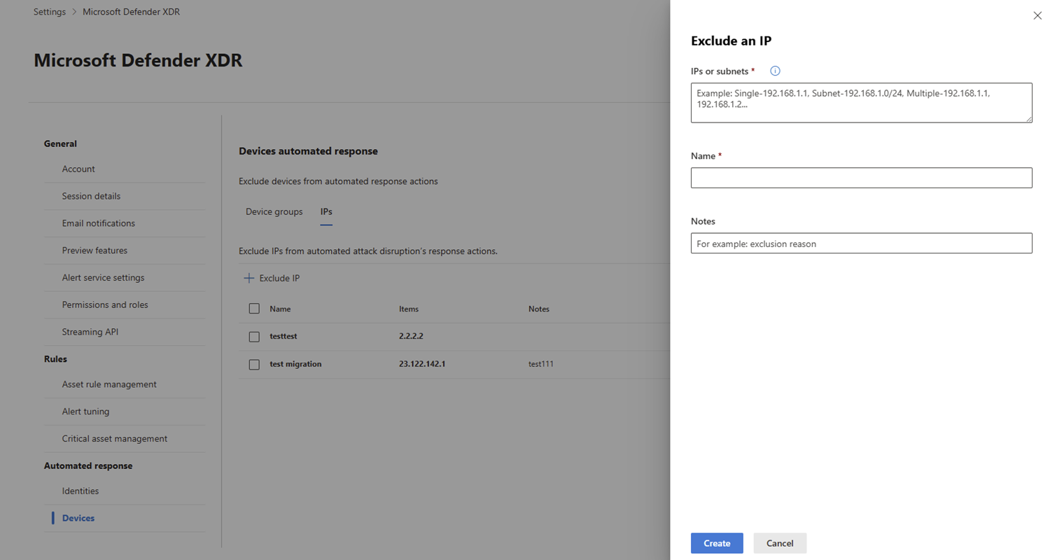 La interrupción automática de ataques permite excluir cuentas de usuario, dispositivos y direcciones IP específicas de las acciones de contención automatizadas. Una vez excluidos, estos recursos no se verán afectados por acciones automatizadas desencadenadas por la interrupción de ataques.