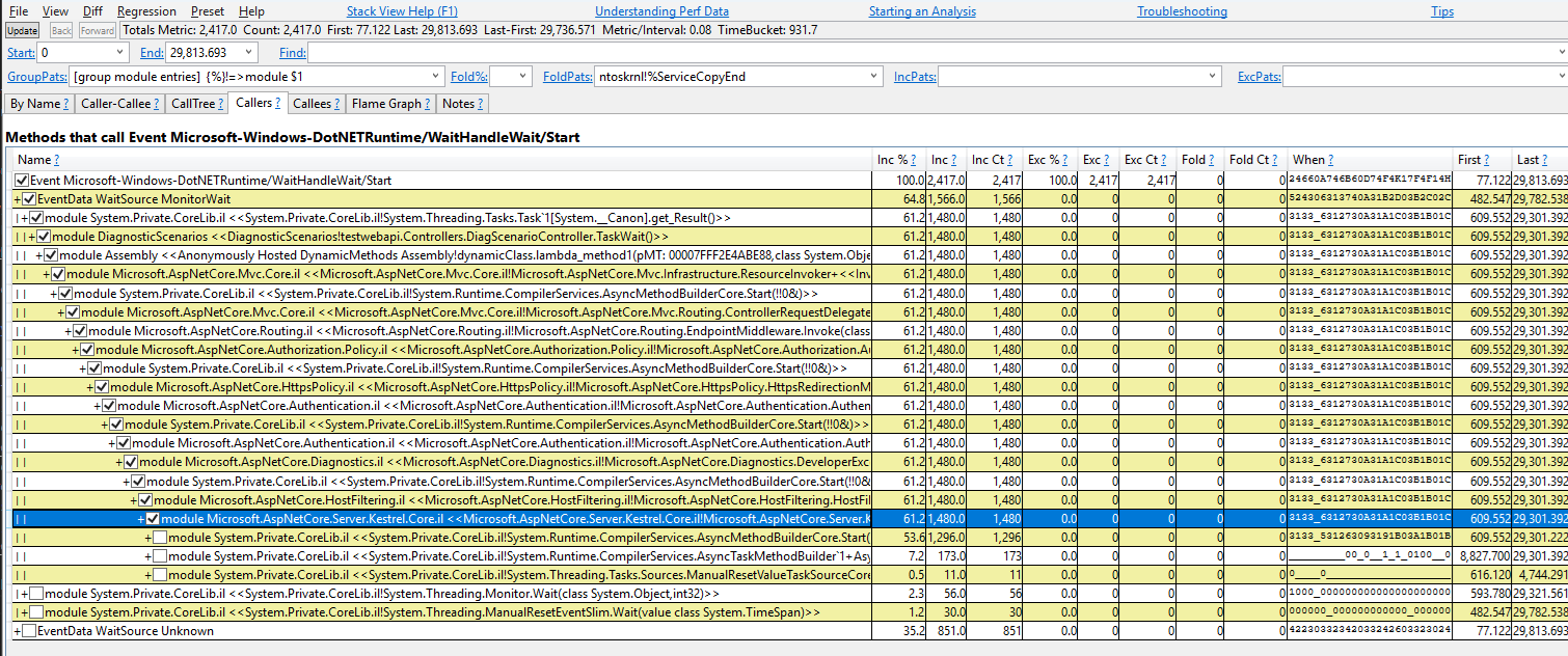 Ahora debería ver los rastros de pila donde se emitieron los eventos WaitHandleWait. Se dividen según "WaitSource". Actualmente hay dos orígenes:
