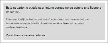 La ejecución de los diagnósticos puede identificar problemas para esa cuenta en Azure AD. En este ejemplo, al usuario no se le asignó una licencia para Intune, lo que impide la inscripción de dispositivos y vemos un vínculo al contenido pertinente: