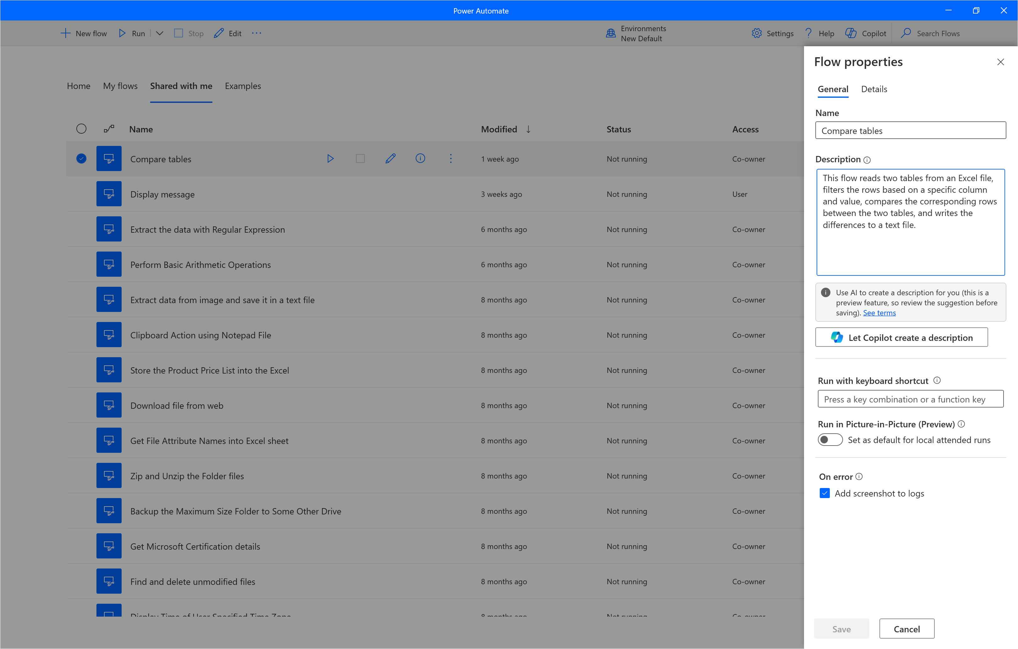 Genere una descripción de los flujos de los que es propietario o copropietario pulsando un botón. A continuación, Copilot analiza el flujo y genera una descripción del mismo. Esta característica también está disponible en los detalles del flujo en make.powerautomate.com. Más información: Administrar flujos de escritorio
