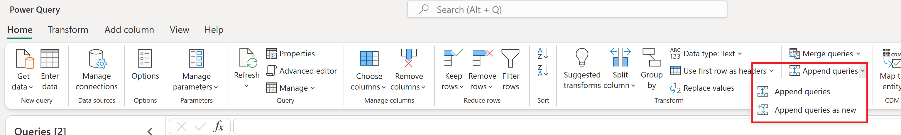 Puede encontrar el comando Anexar consultas en la pestaña Inicio del grupo Combinar . En el menú desplegable, hay dos opciones: