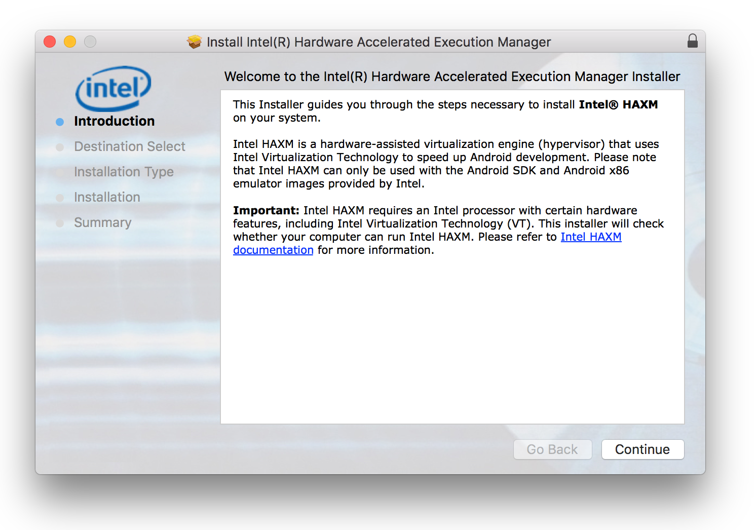 En la página de Intel Hardware Accelerated Execution Manager hay disponibles paquetes de instalación de HAXM para macOS. Siga estos pasos para descargar e instalar HAXM: