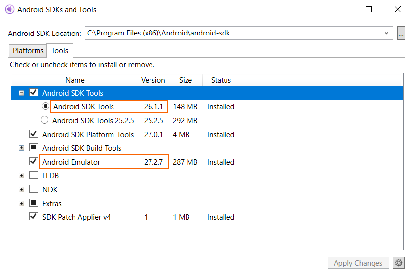 Instale el paquete 27.2.7 o posterior de Android Emulator. Para instalar este paquete, vaya a Herramientas > Android > Android SDK Manager en Visual Studio. Seleccione la pestaña Herramientas y asegúrese de que la versión de Android Emulator sea como mínimo la 27.2.7. Asegúrese también de que la versión de Android SDK Tools sea la 26.1.1 o posterior: