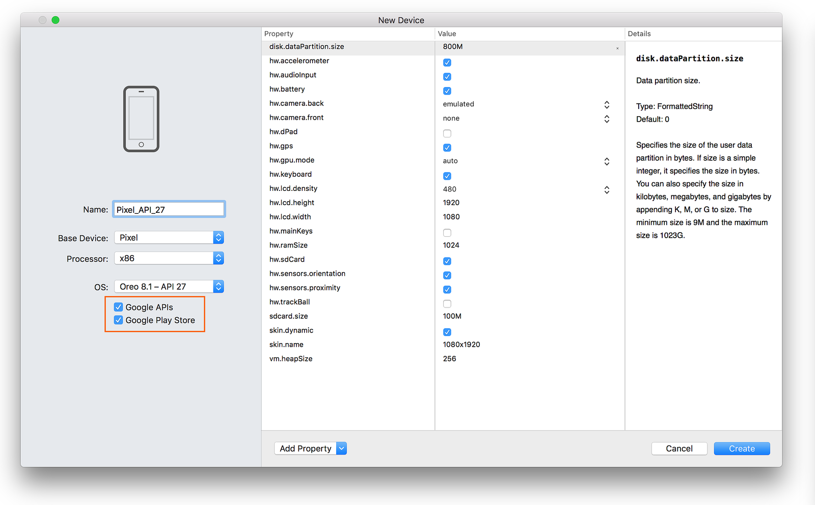 - Google Play Store: incluye Google Play Store en el dispositivo virtual.