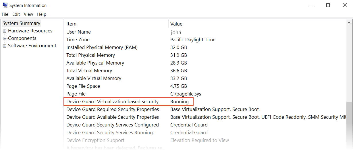 En Resumen del sistema, compruebe si está presente Seguridad basada en la virtualización de Device Guard y si su estado es En ejecución: