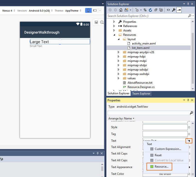 Algunas propiedades pueden hacer referencia a recursos definidos en archivos distintos del archivo .axml de diseño. Los casos más comunes de este tipo son recursos string y drawable. Sin embargo, también se pueden usar referencias para otros recursos, como valores y dimensiones Boolean. Cuando una propiedad admite referencias de recursos, se muestra un icono de exploración (un cuadrado) junto a la entrada de texto de la propiedad. Cuando se hace clic en este botón, se abre un selector de recursos.
