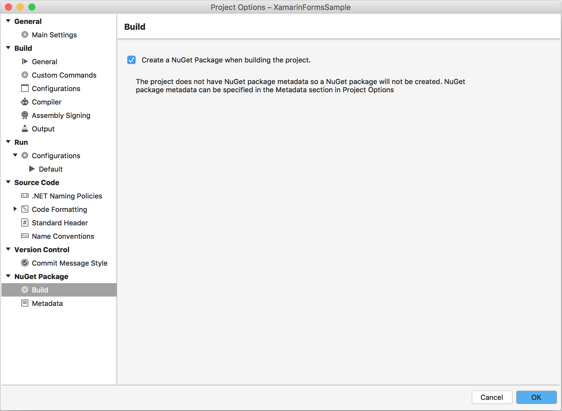 Las bibliotecas de PCL o .NET Standard existentes se pueden convertir en paquetes NuGet mediante la ventana Opciones del proyecto: