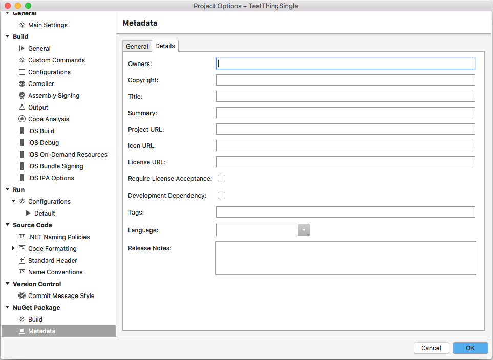 Todos los campos de esta pestaña deben escribirse; De lo contrario, aparecerá un mensaje de error: "El proyecto no tiene metadatos de NuGet para que no se cree un paquete NuGet. Los metadatos del paquete NuGet se pueden especificar en la sección Metadatos de Opciones del proyecto"