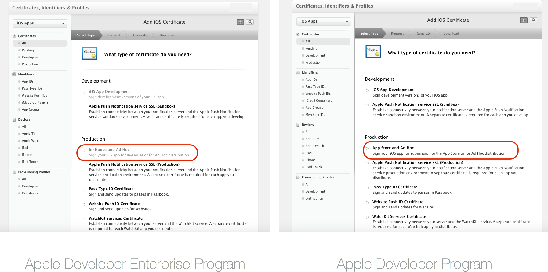 La distribución ad hoc tiene la ventaja de que no requiere aprobación de App Store y puede instalarse de forma remota desde un servidor web o a través de iTunes. Pero está limitada a 100 dispositivos por año de suscripción, tanto para el desarrollo como para la distribución, y deben agregarse manualmente por su UDID en el Centro de usuarios registrados. Para obtener más información sobre cómo agregar dispositivos, visite la guía Device Provisioning (Aprovisionamiento de dispositivos).