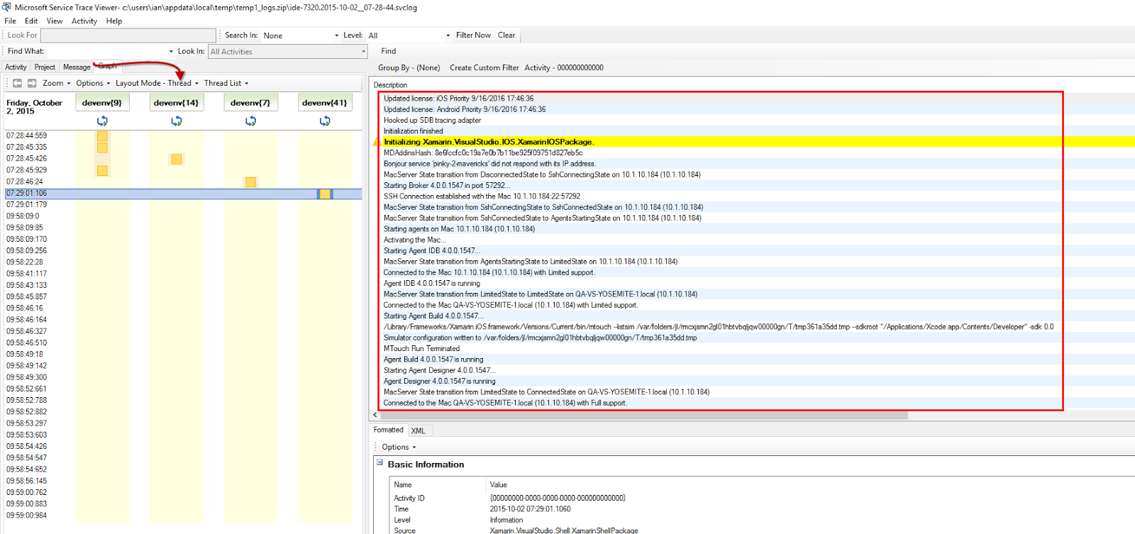 El archivo .svclog se abrirá en Microsoft Service Trace Viewer. Puede examinar los mensajes por hilo para ver grupos de mensajes relacionados. Para navegar por hilo, primero seleccione la pestaña Graph, luego haga clic en el menú desplegable Modo de Diseño y seleccione Hilo.