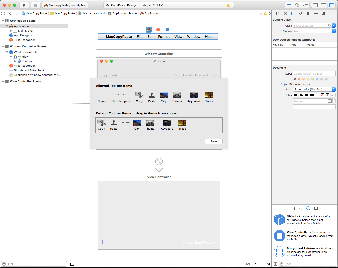 Haga doble clic en el archivo Main.storyboard para abrirlo en Xcode. A continuación, agregue una barra de herramientas y una imagen bien y configúrelas de la siguiente manera: