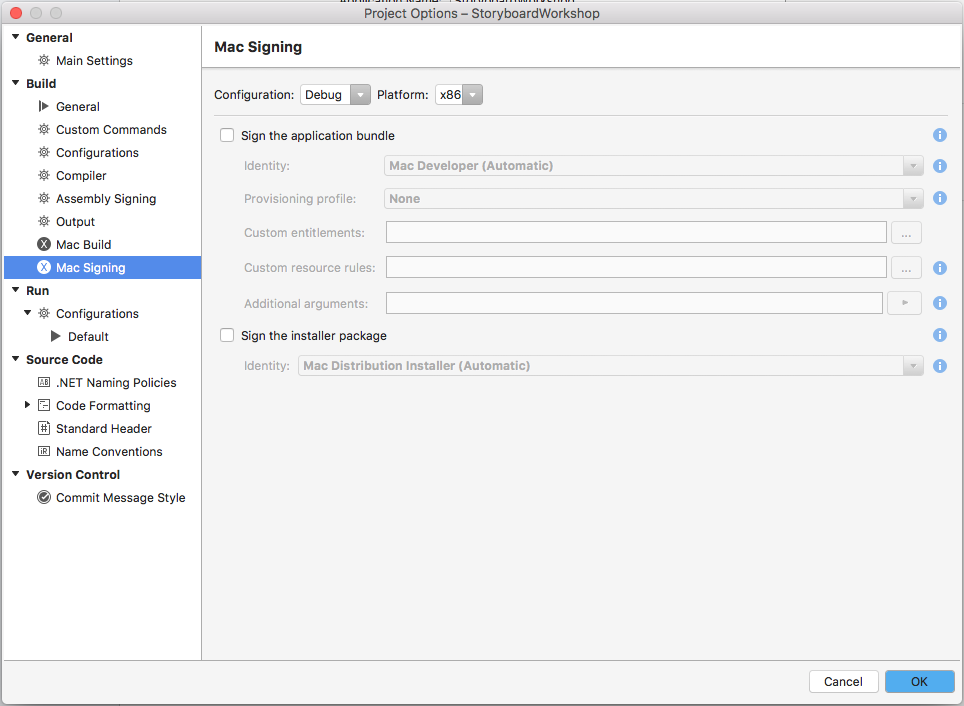 La sección Firma de Mac del cuadro de diálogo Opciones de proyecto permite al desarrollador firmar una aplicación de Xamarin.Mac para las pruebas, para autopublicación o para publicación a través del App Store de Apple: