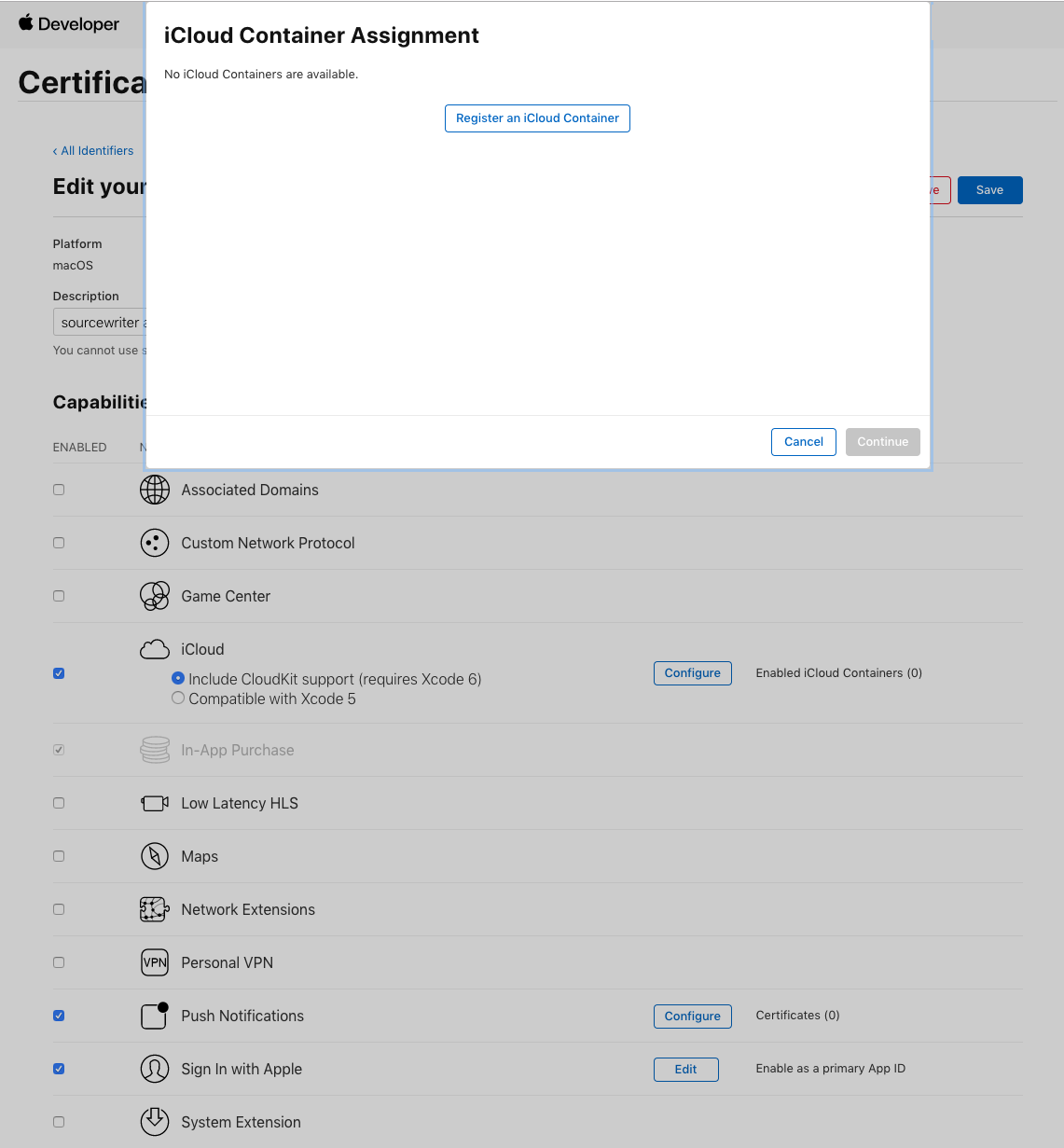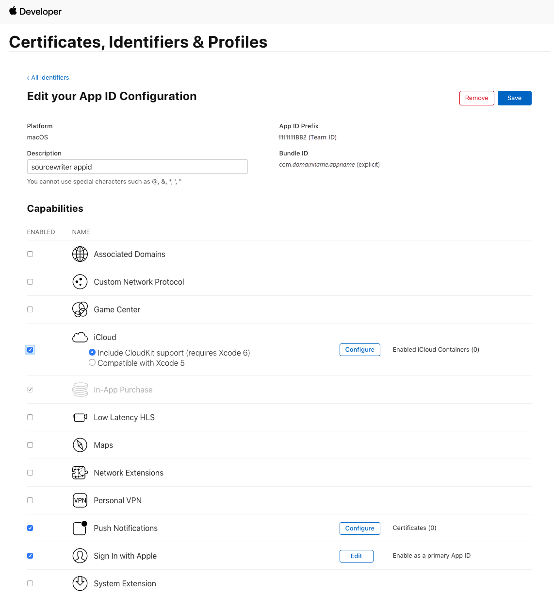 Algunos App Services podrían necesitar configuración adicional (por ejemplo, iCloud). Si ese fuera el caso, seleccione el nuevo identificador de aplicación que acaba de crear y haga clic en el botón Editar: