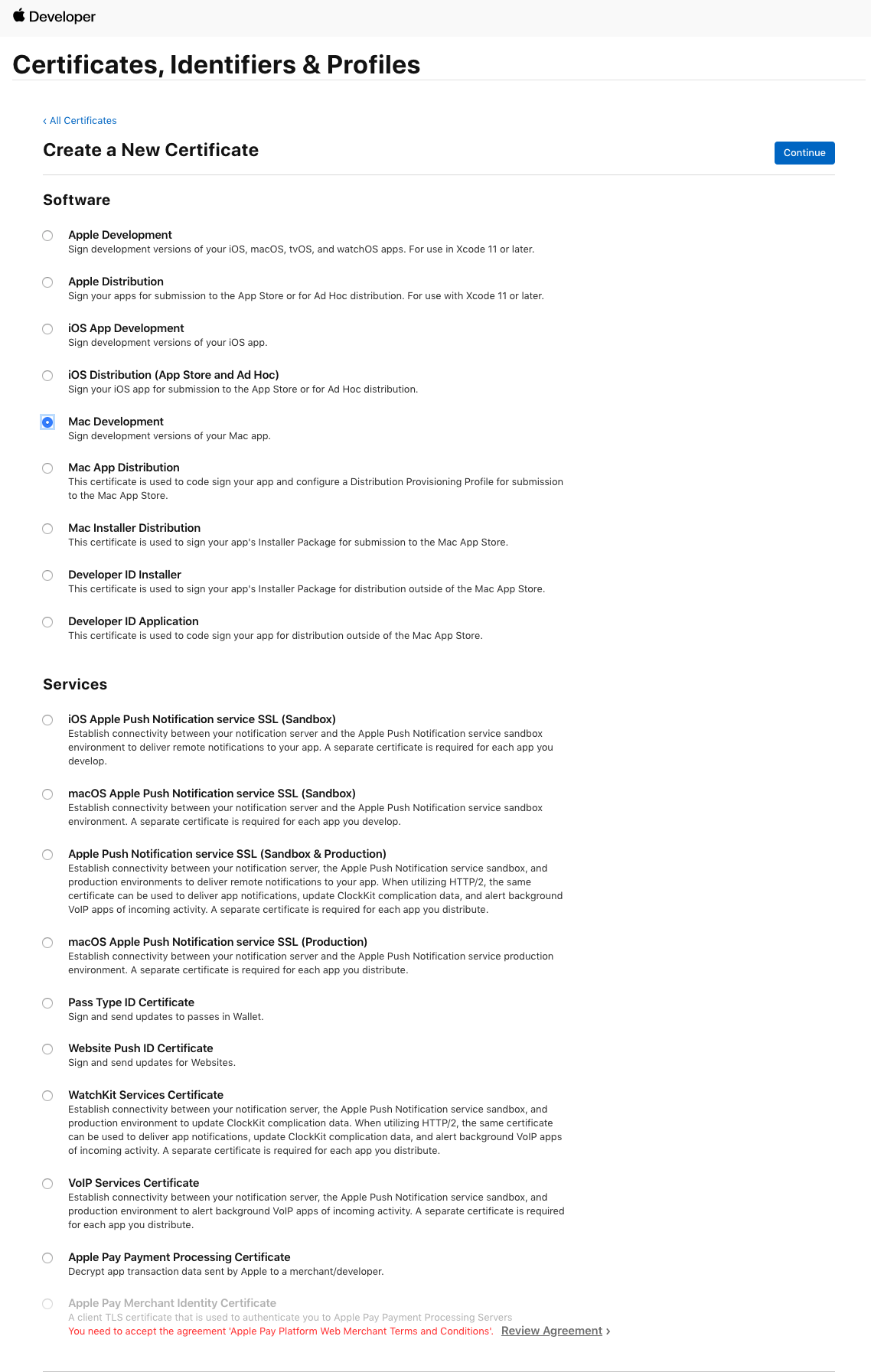 Active el botón de radio Mac Development (Desarrollo de Mac) y haga clic en Continuar:
