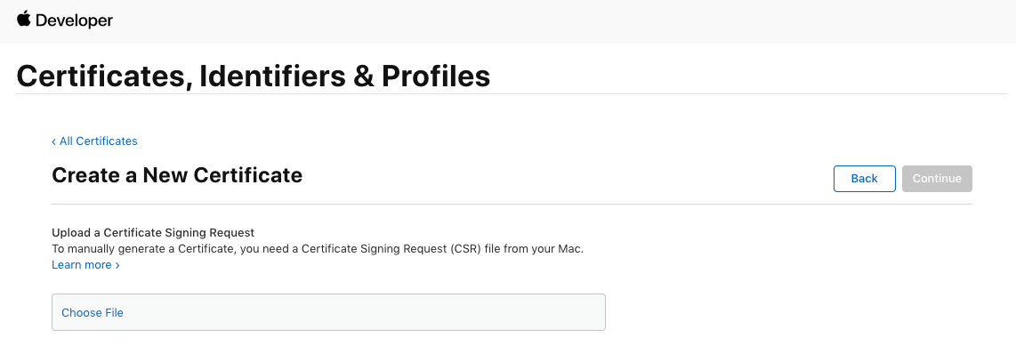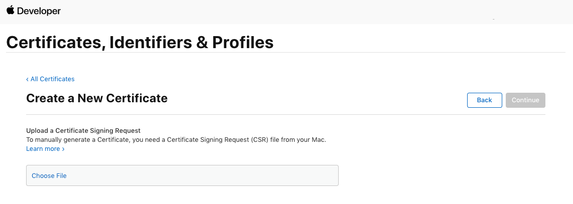 .certSigningRequest) se guardará localmente en el equipo Mac. Haga clic en Choose file (Elegir archivo) para seleccionar la solicitud de certificado y, a continuación, presione Continue (Continuar).Siga el vínculo Más información > para obtener instrucciones sobre cómo usar Keychain Access para crear un archivo de solicitud de certificado.