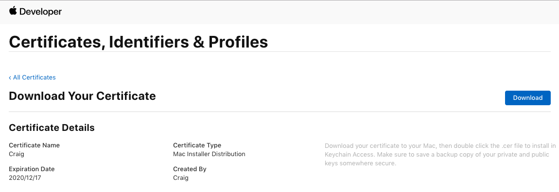 - Distribución de instaladores de Mac: el desarrollador necesitará un certificado para la aplicación y otro certificado para el instalador.