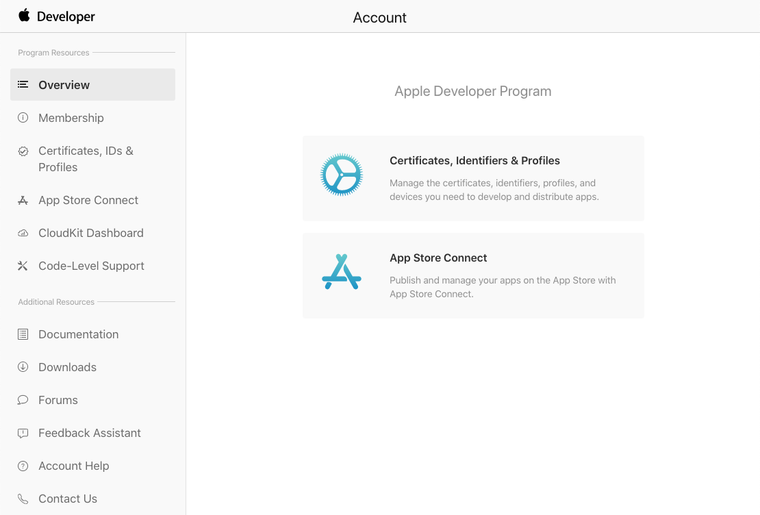 Visite el Centro de usuarios registrados de Apple Developer para configurar el equipo Mac para desarrollo. Haga clic en el vínculo Account (Cuenta). A continuación se muestra el menú principal: