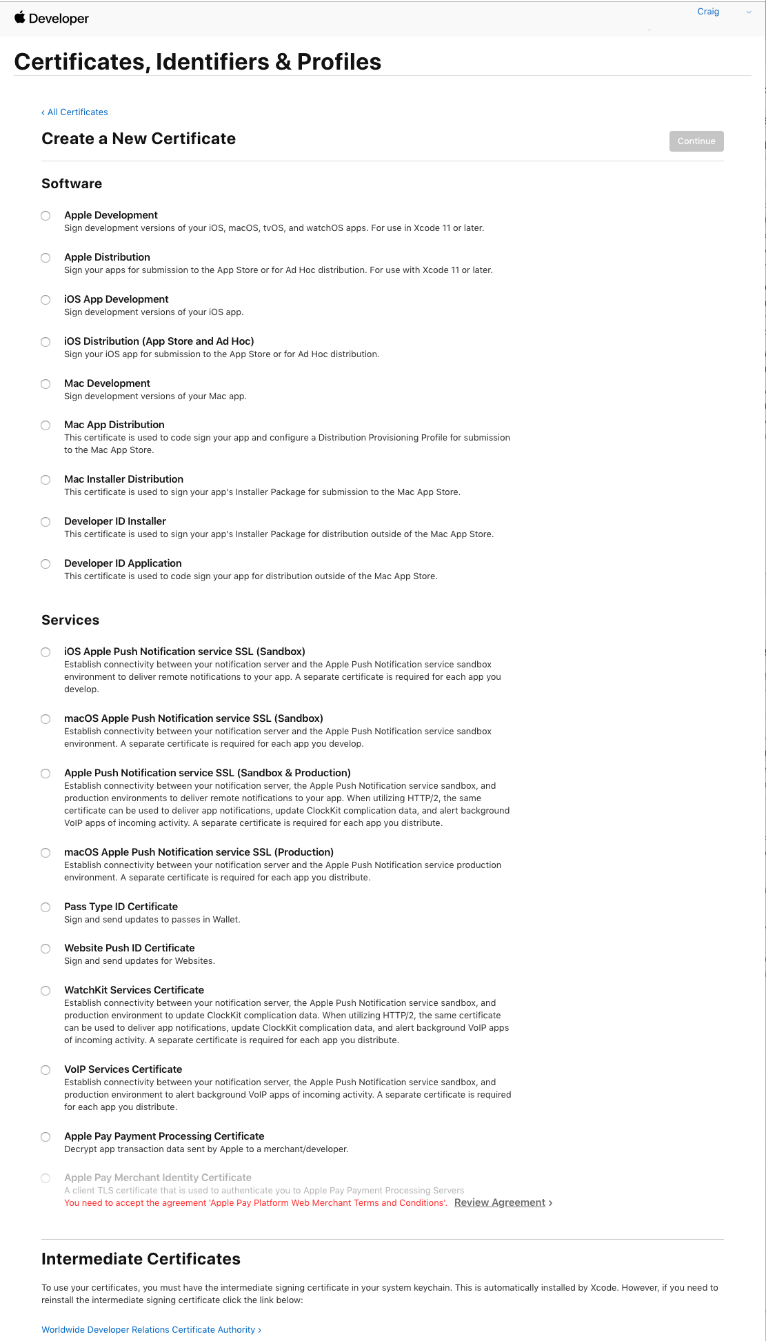 - Distribución de aplicaciones de Mac: el desarrollador necesitará un certificado para la aplicación y otro certificado para el instalador.