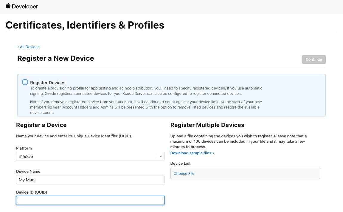 En el Centro para desarrolladores de Mac, seleccione Todos en la sección Dispositivos y haga clic en el botón +: