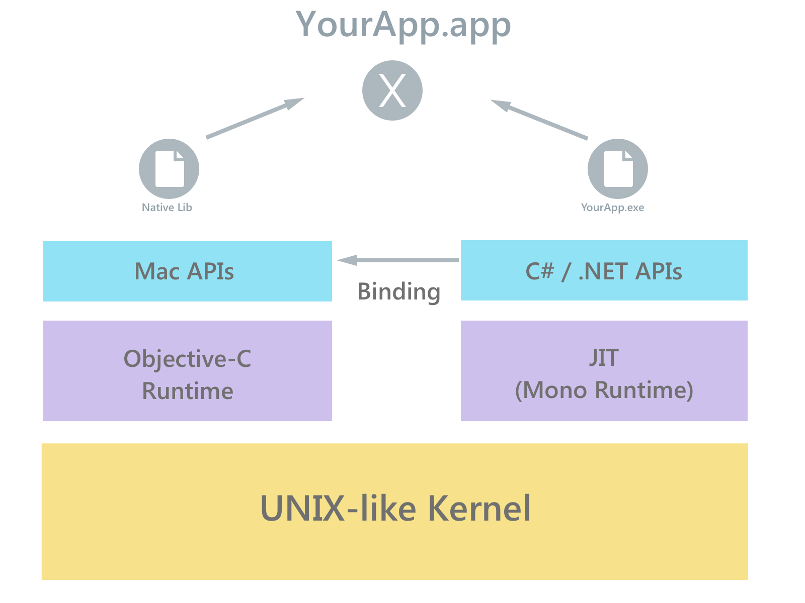 Las aplicaciones de Xamarin.Mac se ejecutan en el entorno de ejecución mono y usan el compilador de Xamarin para compilar hasta el lenguaje intermedio (IL), que luego se compila Just-In-Time (JIT) en código nativo en tiempo de ejecución. Esto se ejecuta en paralelo con el entorno de Objective-C ejecución. Ambos entornos de tiempo de ejecución se ejecutan sobre un kernel similar a UNIX, específicamente XNU, y exponen varias API al código de usuario, lo que permite a los desarrolladores acceder al sistema nativo o administrado subyacente.