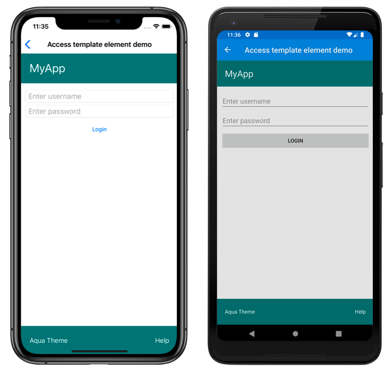 En este ejemplo, se recupera el objeto Label llamado changeThemeLabel una vez que se ha creado una instancia de ControlTemplate. Luego, la clase AccessTemplateElementPage puede acceder a changeThemeLabel y manipularlo. Las capturas de pantalla siguientes muestran que se ha cambiado el texto mostrado por el Label: