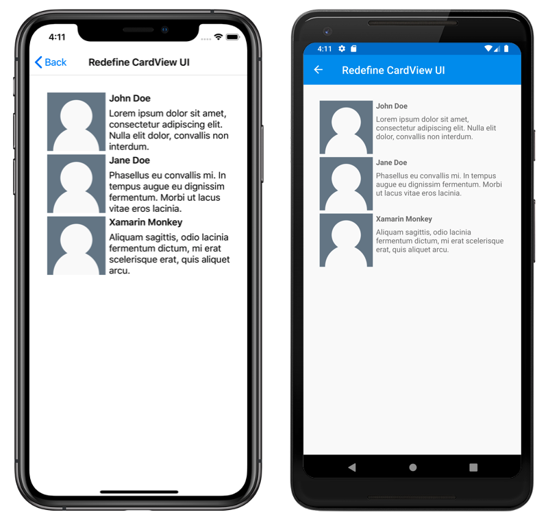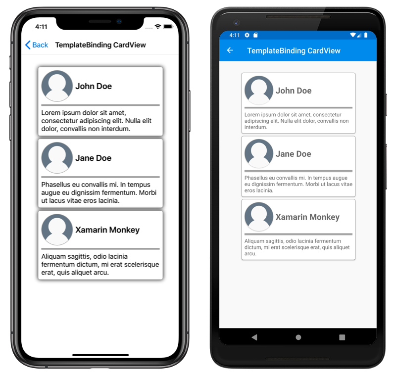 En este ejemplo, el elemento raíz de ControlTemplate es un objeto Frame. El objeto Frame usa la extensión de marcado RelativeSource para establecer su BindingContext en el elemento primario con plantilla. Las expresiones de enlace del objeto Frame y sus elementos secundarios se resuelven a partir de propiedades CardView, por la herencia de BindingContext del elemento Frame raíz. Las capturas de pantallas siguientes muestran la página con la colección People, que consta de tres elementos:
