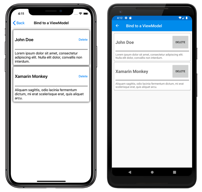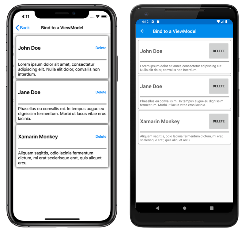 En este ejemplo, el elemento BindingContext de la página se establece en una instancia PeopleViewModel. Este objeto ViewModel expone una colección People y un elemento ICommand llamado DeletePersonCommand. El elemento StackLayout de la página un diseño enlazable para enlazar datos a la colección People y el elemento ItemTemplate del diseño enlazable está establecido en el recurso PersonTemplate. Este elemento DataTemplate especifica que cada elemento de la colección People se mostrará mediante un objeto CardView. La estructura visual del objeto CardView se define mediante un elemento ControlTemplate denominado CardViewControlTemplate: