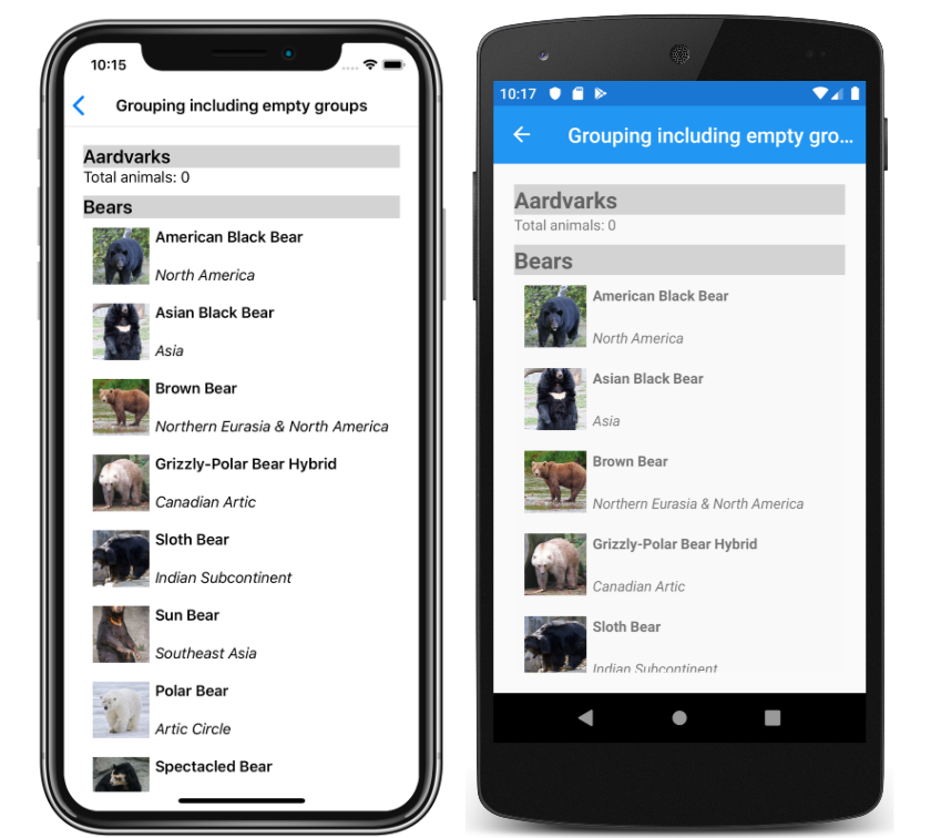 En este ejemplo, cada encabezado de grupo se establece en una Label que muestra el nombre del grupo y que tiene otras propiedades de apariencia establecidas. En las capturas de pantalla siguientes se muestra el encabezado de grupo personalizado: