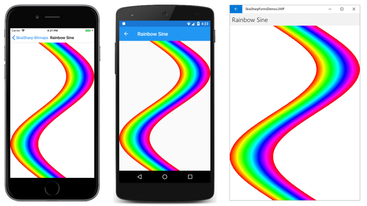 Cada píxel es de cuatro bytes de memoria, por lo que cada byte se debe establecer separado. El código aquí supone que los bytes siguen el orden rojo, verde, azul y alfa, que es coherente con el tipo de color SKColorType.Rgba8888. Recuerde que este es el tipo de color predeterminado para iOS y Android, pero no para la Plataforma Universal de Windows (UWP). De forma predeterminada, la UWP crea mapas de bits con el tipo de color SKColorType.Bgra8888. Por ello, es de esperar que los resultados sean diferentes en esa plataforma.