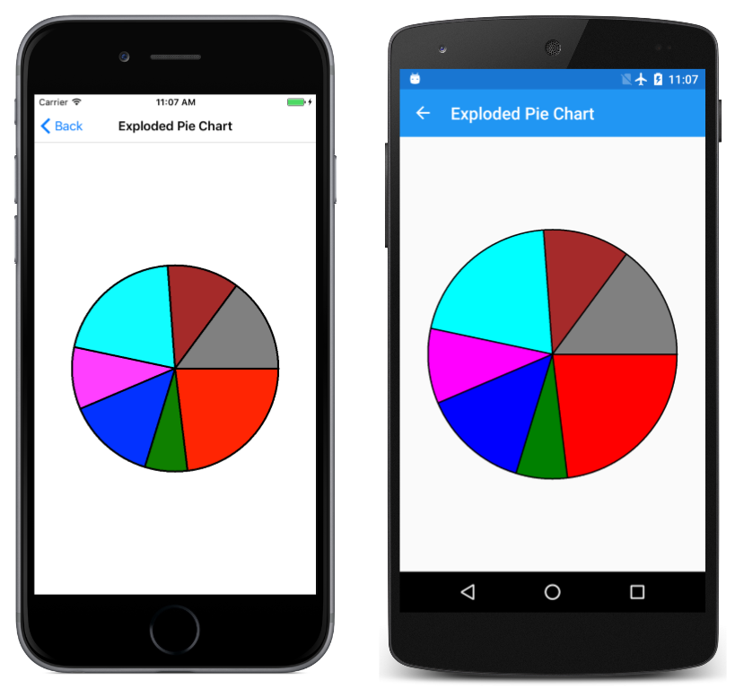 El uso de dos ángulos para definir un arco es el mejor para los casos en los que conoce la longitud angular del arco que desea dibujar, por ejemplo, para crear un gráfico circular. La página del Gráfico circular ampliado lo demuestra. La clase ExplodedPieChartPage usa una clase interna para definir algunos datos y colores fabricados: